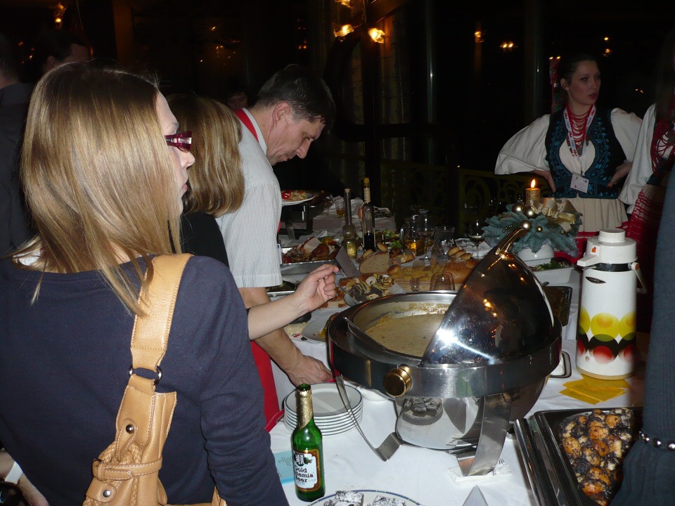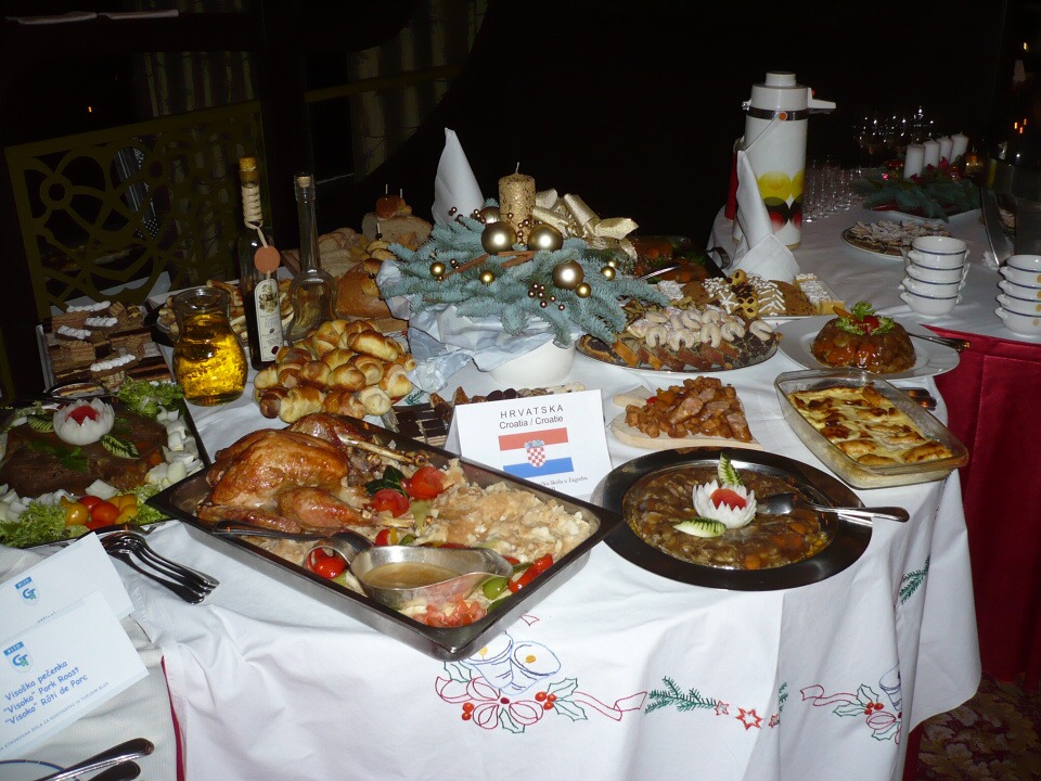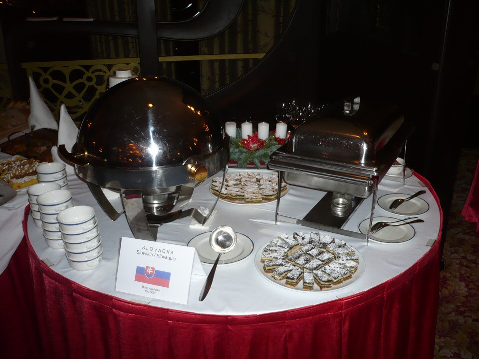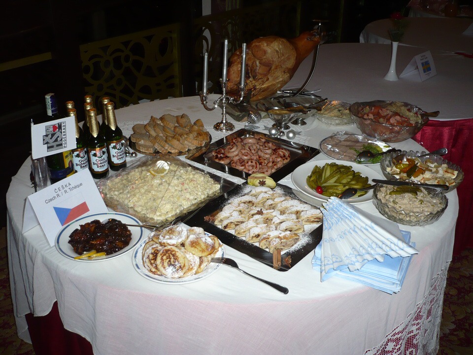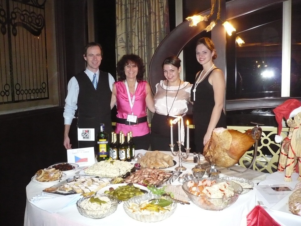 Na slavnostním rautu s nabídkou českých jídel, piva a becherovky jsme nejen doporučovali ty naše, ale i ochutnávali tradiční vánoční pokrmy a nápoje všech zemí a nechyběl ani kulturní program plný vánočních koled a národních tanců.